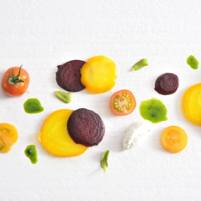CARPACCIO DE TOMATES ET DE BETTERAVES MULTICOLORES, HUILE DE BASILIC ET MOUSSE AU FROMAGE DE CHÈVRE ET CITRON