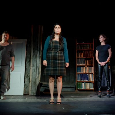 Je rentre au Petit Théâtre du Vieux Noranda. Sur la scène, des murs faits en planches, en palettes, et des cageots en bois qui délimitent
